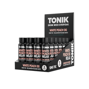 TONIK Shots deliver bold, zero-sugar wellness with a twist. Infused with 10mg of THC, the White Peach OG flavor combines a light burst of white peach with a smooth, relaxing finish. Perfectly crafted for moments when you need to unwind, this shot offers convenience, great taste, and the ultimate chill experience.